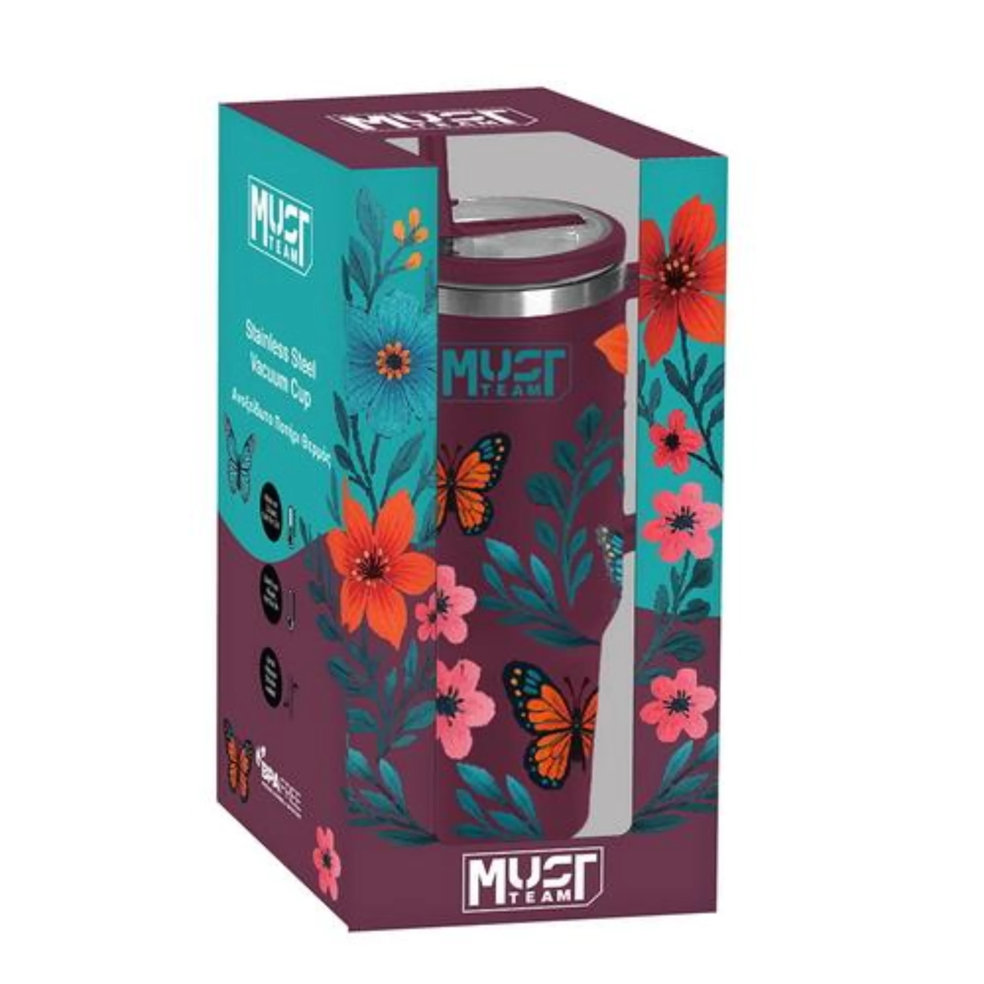 Ποτήρι Θερμός Ανοξείδωτο Must Team Μπορντω Φλοράλ 1200 ml με καλαμάκι