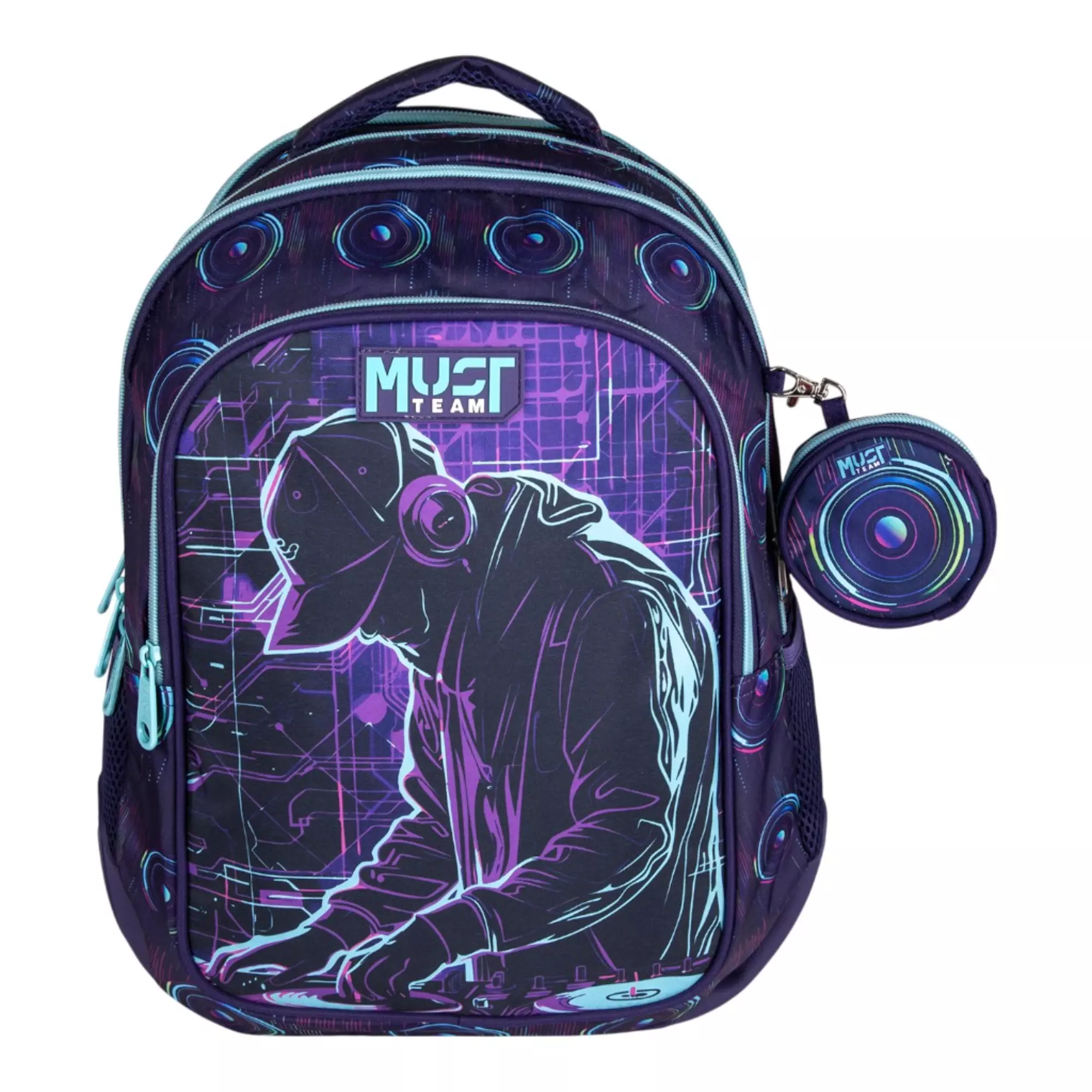 – Η Σχολική Τσάντα Πλάτης Δημοτικού Must Team Multi Dj 4 θήκες (3 κεντρικές θήκες, 1 θήκη στο μπροστινό μέρος) για τα βιβλία, τα τετράδια, την κασετίνα και όλα τα απαραίτητα σχολικά είδη γραφής